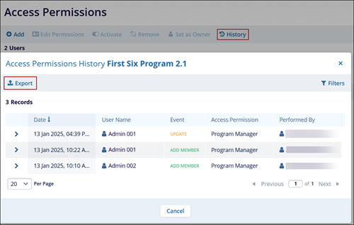- On the History screen, click on Export to retrieve the Access Permission History