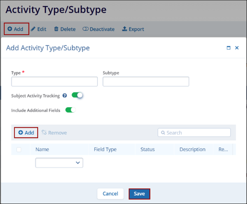 - On the Activity Type/Subtype screen, click on the +Add button.