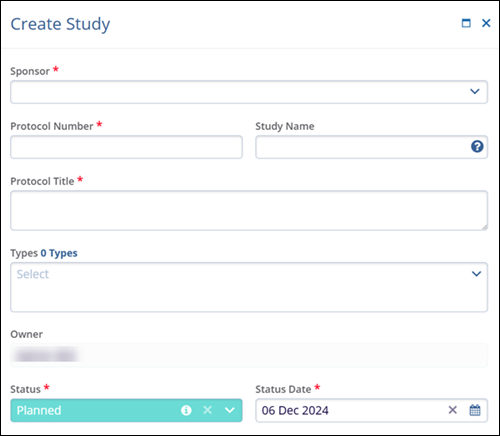 - Owner: This field is not editable and displays the name of the user creating a study.