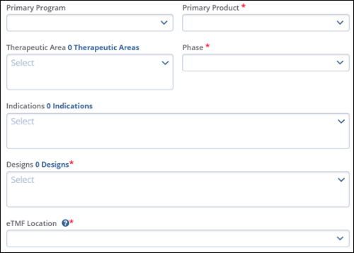 - eTMF Location*: Select eTMF location from the available dropdown options.
