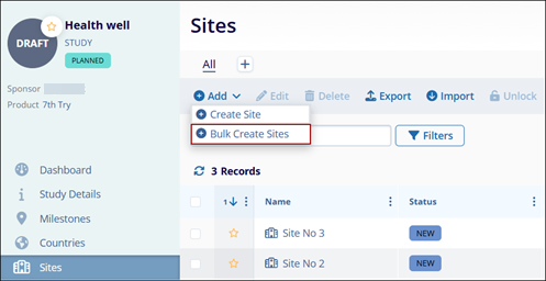 - On the Sites screen, click on the +Add button from the top menu bar and
