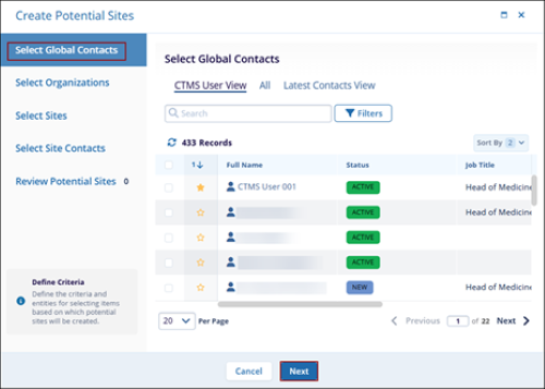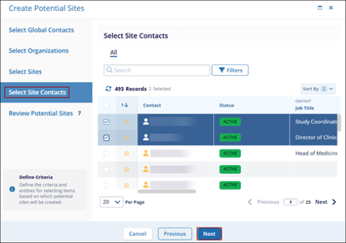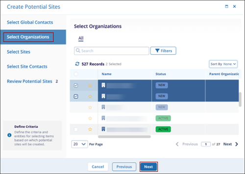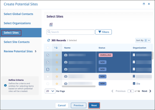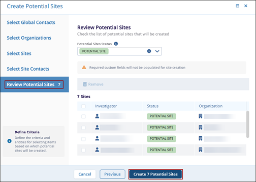 - On the Review Potential Sites section, view the list of potential sites that will be