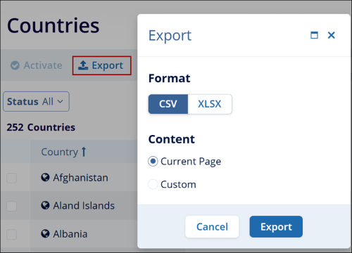 - Click on the Export button to export the data in an XLSX or CSV file format.