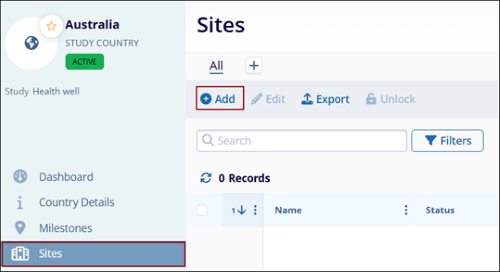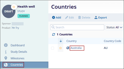 - Click on a Country name in the countries tab within a Study.