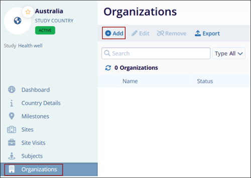 - On the Organization tab within the country, click on the +Add button.