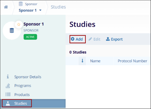 - On the Studies screen, click on the +Add button to add a new study at the sponsor