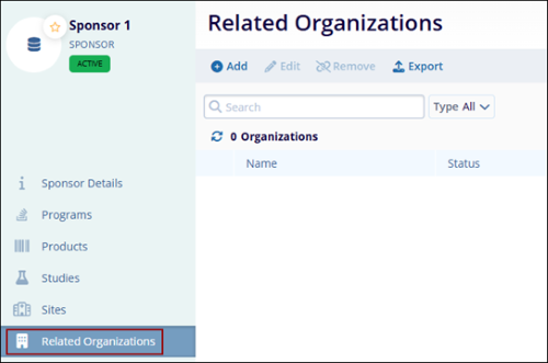 - On the Sponsor details screen, select Related Organizations from the left-hand