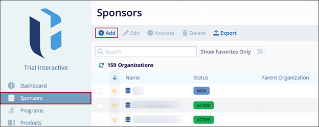- From the left-hand navigation links, select Sponsors. The Sponsors screen opens where all sponsors at the global level are displayed.