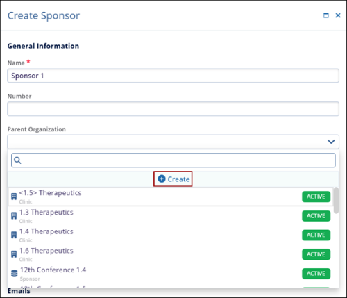 - Parent Organization: To add an existing organization to the sponsor, click on the drop-down arrow and select the appropriate organization from the list. To create a new organization, click on the +Create button.