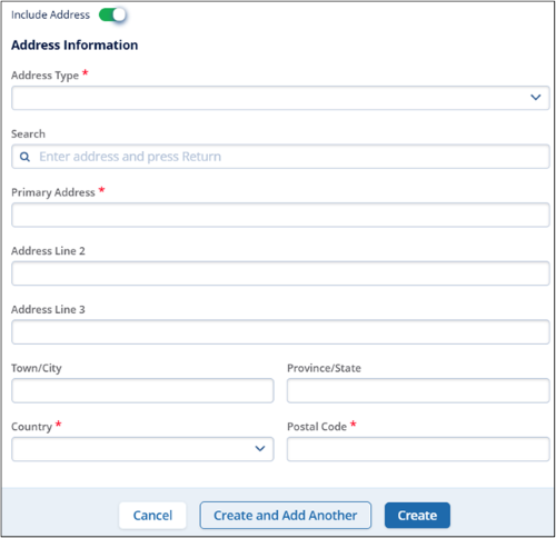 - Toggle the switch to include an address and enter the mandatory details into the respective fields.
