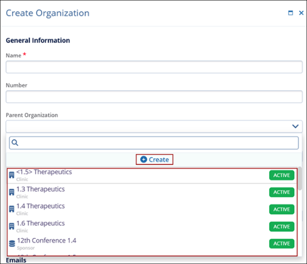 create a new parent organization, click on the +Create button.