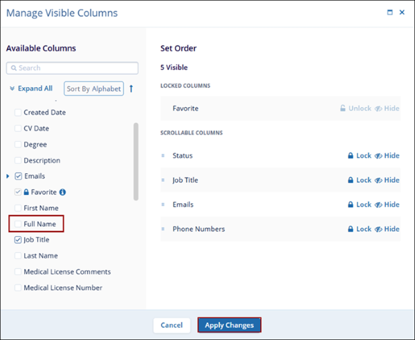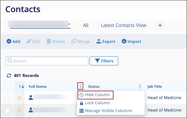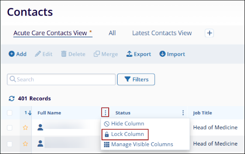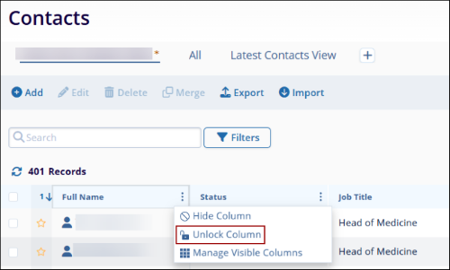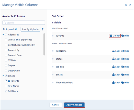 - Click on Unlock or Hide in the Locked Columns section so that the corresponding actions will be reflected on the main Contacts screen.