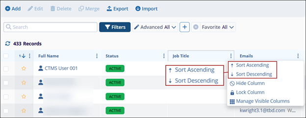 The Sort Ascending and Descending options are available only for the Status and Job Title columns.
