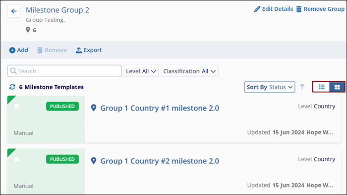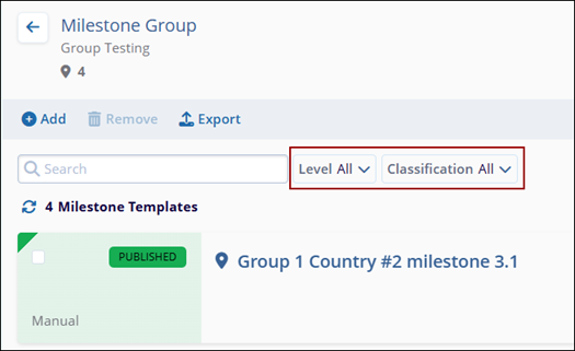 Users can apply filters and sorting criteria, as well as customize the screen view of the selected milestone group.