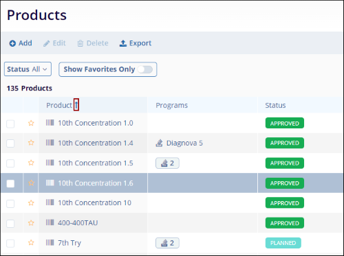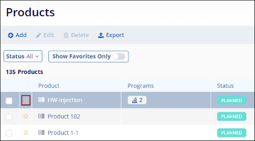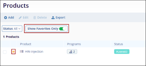 Note: By default, the Status filter is applied to the Products screen, and the dropdown options display all the statuses the user can select. - Switch the Show Favorites Only toggle button to display records marked as