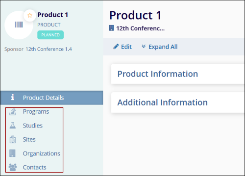 Users can add Programs, Studies, Sites, Organizations and Contacts at a product level by accessing the Product Details screen.