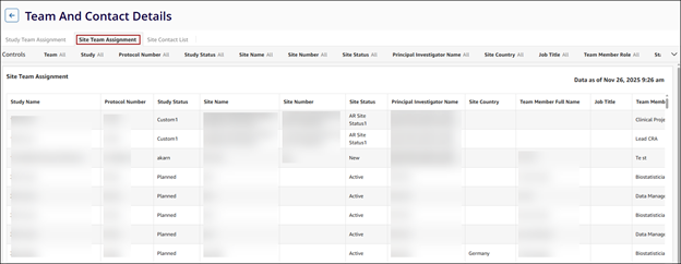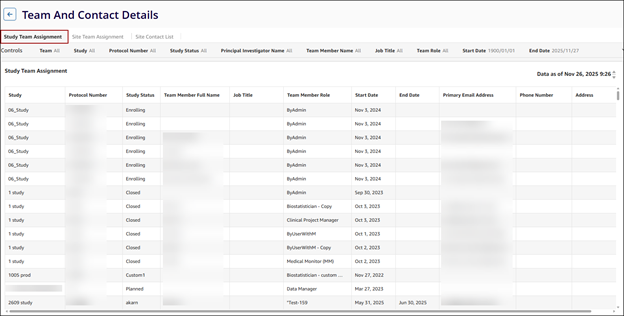 The Cross Study Team Assignment dashboard displays a comprehensive, domain-level view of study team assignments across all studies within the customer’s domain/CTMS. The dashboard consolidates data from multiple studies and displays it in one place.