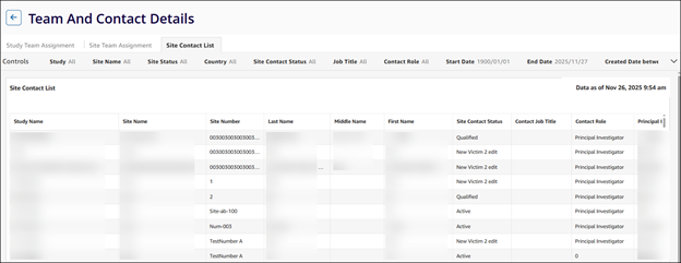 The Site Contact List dashboard displays all site contacts across all studies.