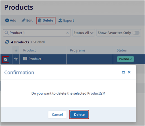 - On the Confirmation popup, click on Delete to confirm the product deletion.
