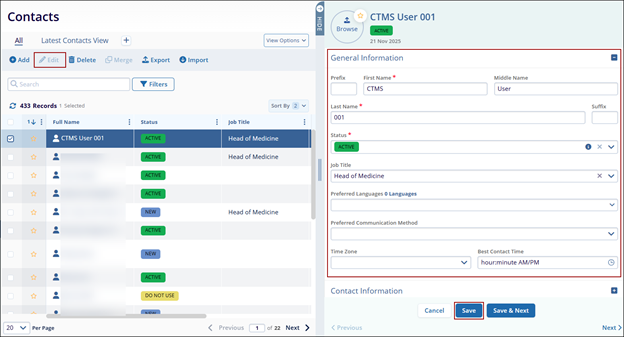 - Clicking on the Save & Next button saves the contact’s edited details and the quick view panel displays details of the contact next in the list.