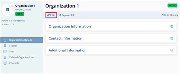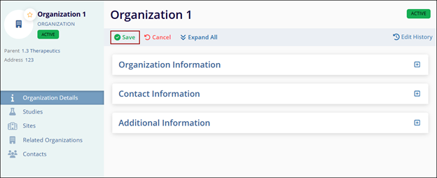 - Click on the Organization name to open the Organization Details screen.