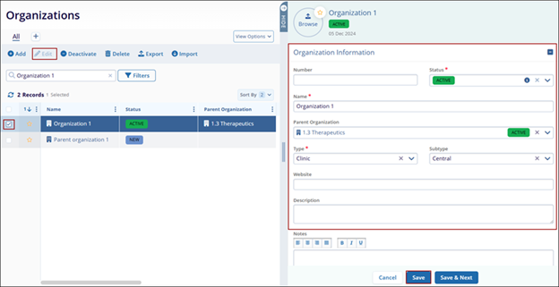 - Click the checkbox next to the organization name. Then, click the Edit button (pencil icon).