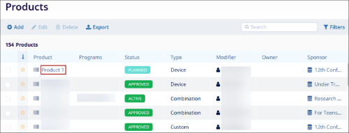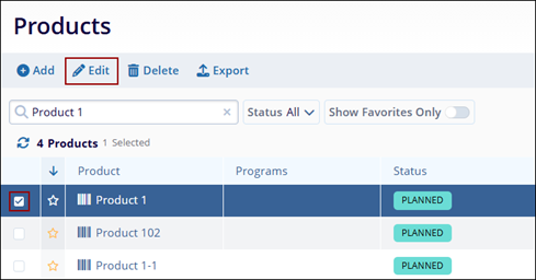 - From the left-hand navigation links, click on the Products. This opens the Products screen with a list of existing products.