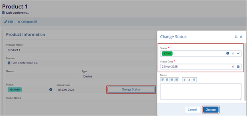 - On the Change Status screen, update the Status*, and Status Date* and enter notes if required.