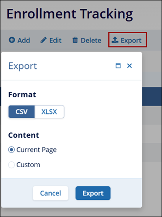 To export the records, click on the Export button to retrieve the enrollment tracking data in an XLSX or CSV file format.