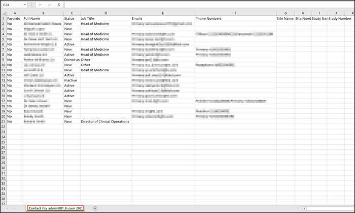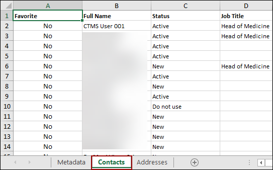 - The CSV file will display just one tab with the contact details.