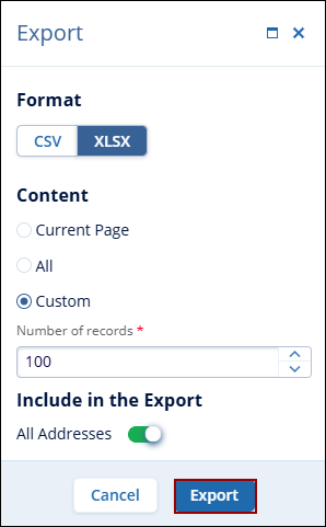 Include in Report: Click on the All Addresses toggle button to include addresses in the exported file.