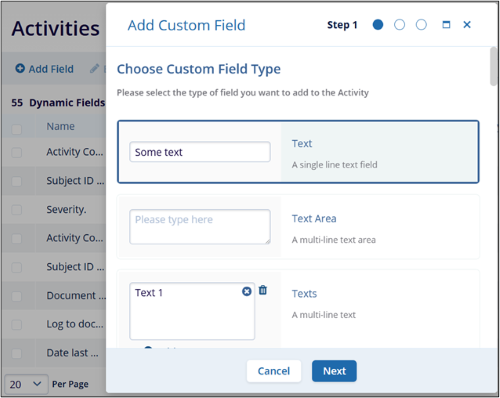 - In step 1 of Add Custom Field form, select the custom field type from the