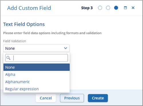 - A tooltip is displayed explaining the meaning of the 'Regular Expression' option selected as a Field Validation type which improves clarity by helping users understand the purpose of 'Regular Expression' when configuring custom text fields within a domain.