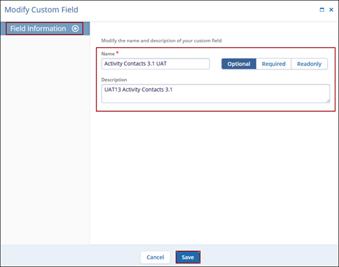 - On the Modify Custom Field window, make the necessary edits within the Field Information section.