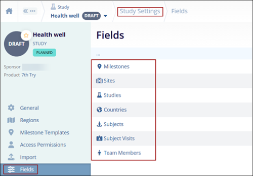 - On the Study Settings screen, click on the Fields option from the left-hand navigation pane.