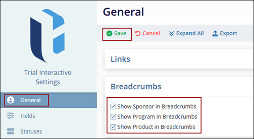 To configure the breadcrumbs, go to the Breadcrumbs section under General Settings, select or clear the desired checkboxes to adjust breadcrumb visibility, and then click the ‘Save’ button.