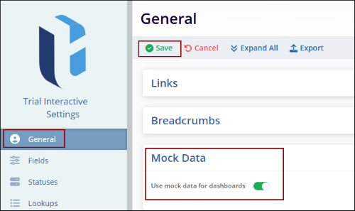 To configure the Mock Data setting, enable or disable the Use mock data for dashboards toggle switch and click on the Save button.