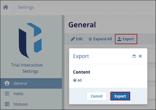 - Click on the Export button on the Export popup to download a XLSX file with the General setting details.