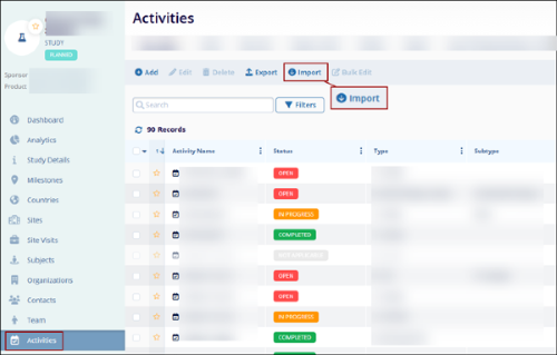 - Within the Activities tab of a Study profile, click on the Import button from