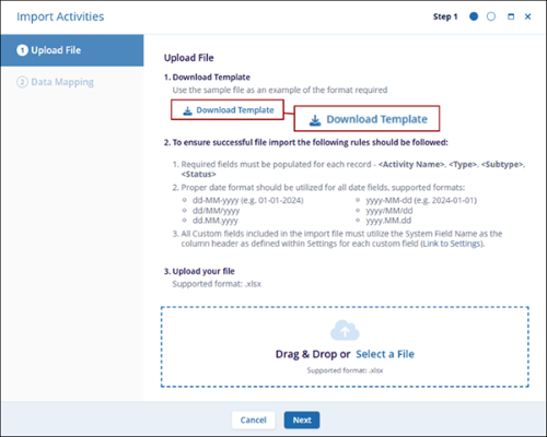- On the Import Activities modal window, click on the Download Template button.