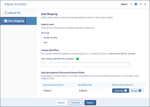 On the Data Mapping screen, define the data import rules and map spreadsheet field to CTMS system fields.