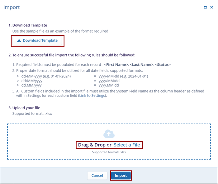 - Upload the file in .xlsx file format either by selecting the file or using the Drag & Drop functionality.