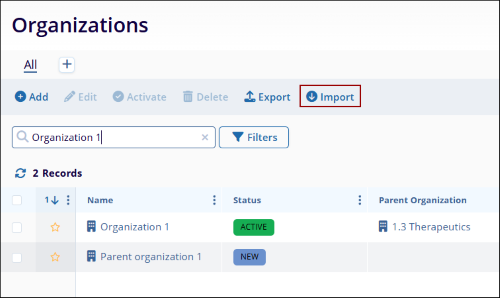 - On the Organizations tab, click on the Import button from the top menu bar.