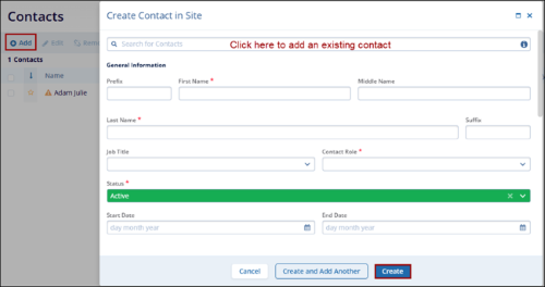 - On the Create Contact in Site form select an existing contact by accessing the Search for Contacts or create a new contact by adding the necessary details.