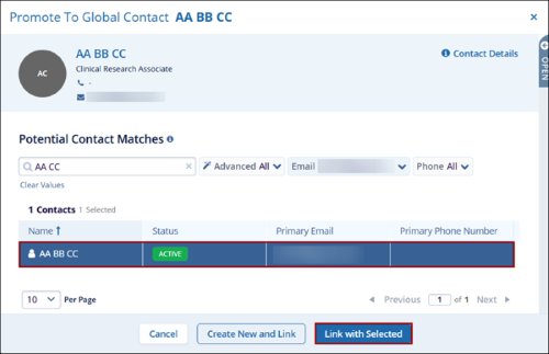 - The Promote to Global Contact screen displays the potential contact matches. Select