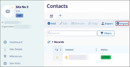 - On the Contacts screen within a site, click on the Import button from the top