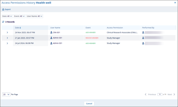 View the details on the Access Permissions History window.