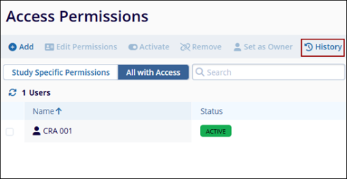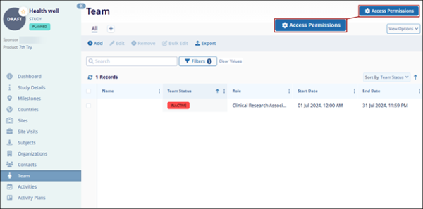 Users will see an Access Permissions button at the top-right of the Study Team area. Clicking on that button will navigate to the Site or Study Settings area as appropriate and the Access Permissions menu. Users can also navigate directly thereby accessing the settings area directly.