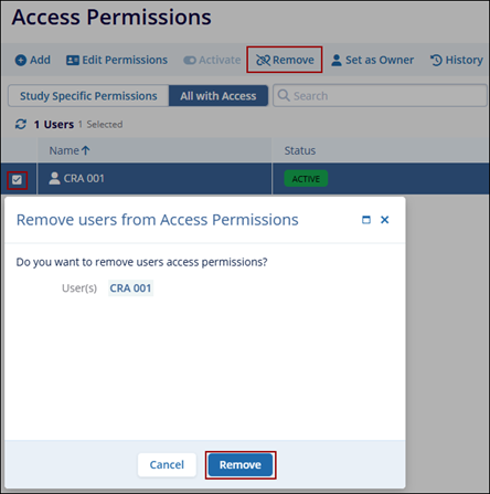 To remove a user from access permissions, follow the steps below:
