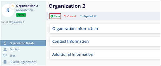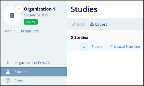 - On the Organization Details screen, click on the Studies from the left-hand navigation links.